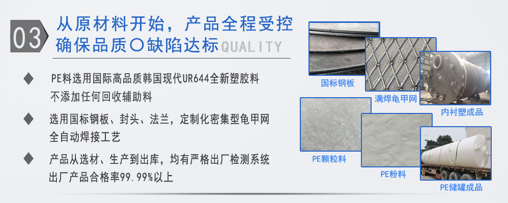 公司有鋼襯塑PE/PO、PE全塑、碳鋼、不銹鋼四大系列100多個品種,專注于常壓儲存容器生產(chǎn),其產(chǎn)品包括鋼襯塑儲罐、管口一體成型PE儲罐、碳鋼儲罐、不銹鋼儲罐、反應(yīng)釜、攪拌罐、離子交換柱、鋼襯PE/PO儲罐、塑料儲罐、鹽酸儲罐、硫酸儲罐等等。更大限度滿足廣大客戶的各種需求,同時可以根據(jù)客戶的需要加工定制各種防腐設(shè)備。